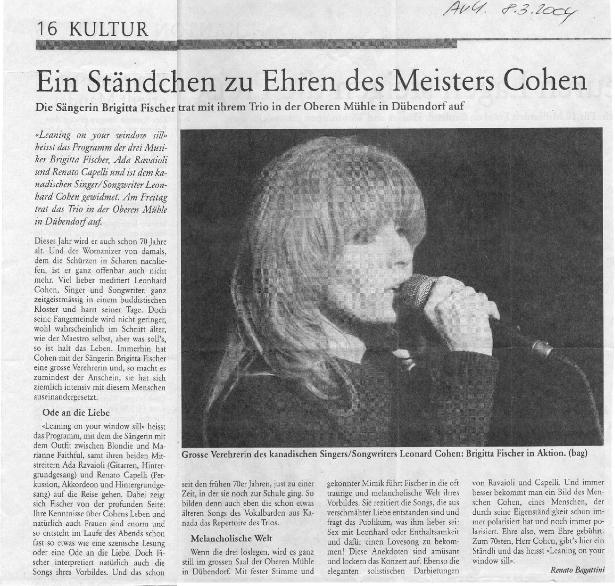 Stilsicher führt Euch die Zürcher Sängerin & Performerin BRIGITTA FISCHER durch ein abendfüllendes Konzert in zwei Teilen, mit Tiefsinn & Schalk kommentiert sie zwischen den wohleinstudierten LEONARD COHEN-Tracks die Texte des ewigen Romantikers aus Kanada! Gewinnt durch die weibliche Perspektive zusätzlich noch an Kontrast im archetypischen, delikaten Mann/Frau-Thema. Nachdem sie früher das Programm bereits Solo aufführte, hat sie zum 70. Geburtstag des Poeten ein exklusives Trio zusammengestellt mit ADA RAVAIOLI (Guitar, Backing Vocals) und RENATO CAPELLI (Accordion, Percussion, Backing Vocals), während BRIGITTA FISCHER sich diesmal voll auf das Mikrofon konzentrieren kann.
